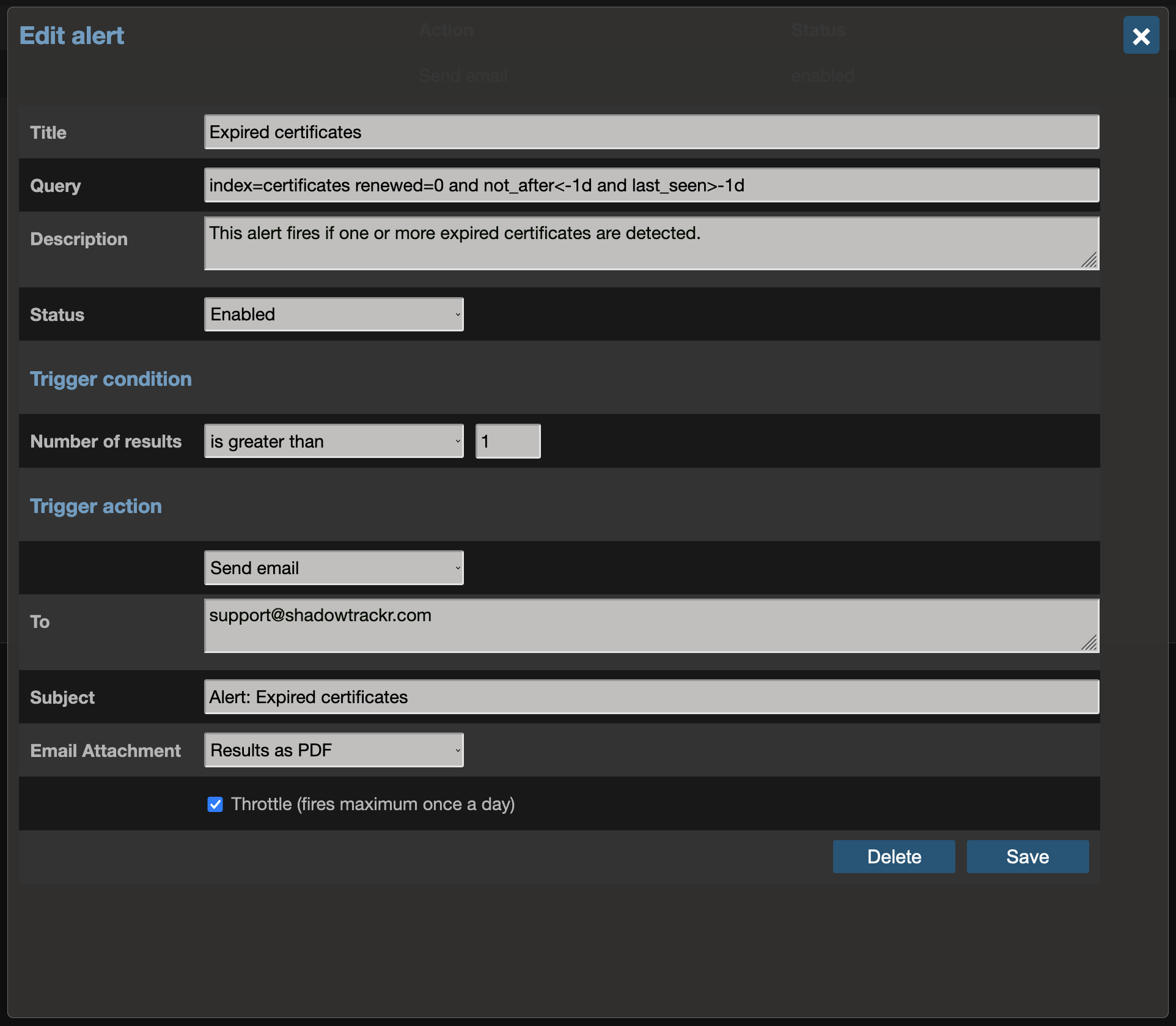 Next, you can specify the trigger action. In any case, and event indicating your alert fired will be added to your timeline. Additional actions are sending the results of the query as Excel, csv, json or file file by email, or calling a webhook will the results as json data.